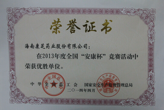 近日,中華全國總工會、國家安全生產(chǎn)監(jiān)督管理總局向康芝藥業(yè)授予了2013年度全國“安康杯”競賽活動“示范單位”榮譽稱號,并頒發(fā)牌匾及榮譽證書以資鼓勵。