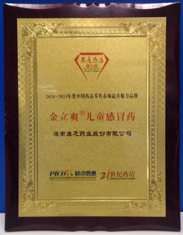 會議首先公布了2014年度中國制藥工業百強榜、中國連鎖藥店綜合實力百強和中國連鎖藥店直營力百強榜并進行了頒獎,康芝藥業金立爽榮膺“2014-2015年度中國藥品零售市場最具魅力品牌”,充分展示了康芝藥業專注兒童大健康產業的品牌魅力以及擁有多個核心產品的市場競爭力。康芝藥業金立爽是第三代兒童感冒藥,作為國家質量標準起草單位,一直以最高質量標準引領抗病毒兒童感冒藥的品質。此次“2014-2015年度中國藥品零售市場最具魅力品牌”的殊榮是對康芝藥業金立爽的肯定,彰顯了“金立爽氨金黃敏顆粒”作為最受歡迎兒童抗病毒藥物的品牌魅力。