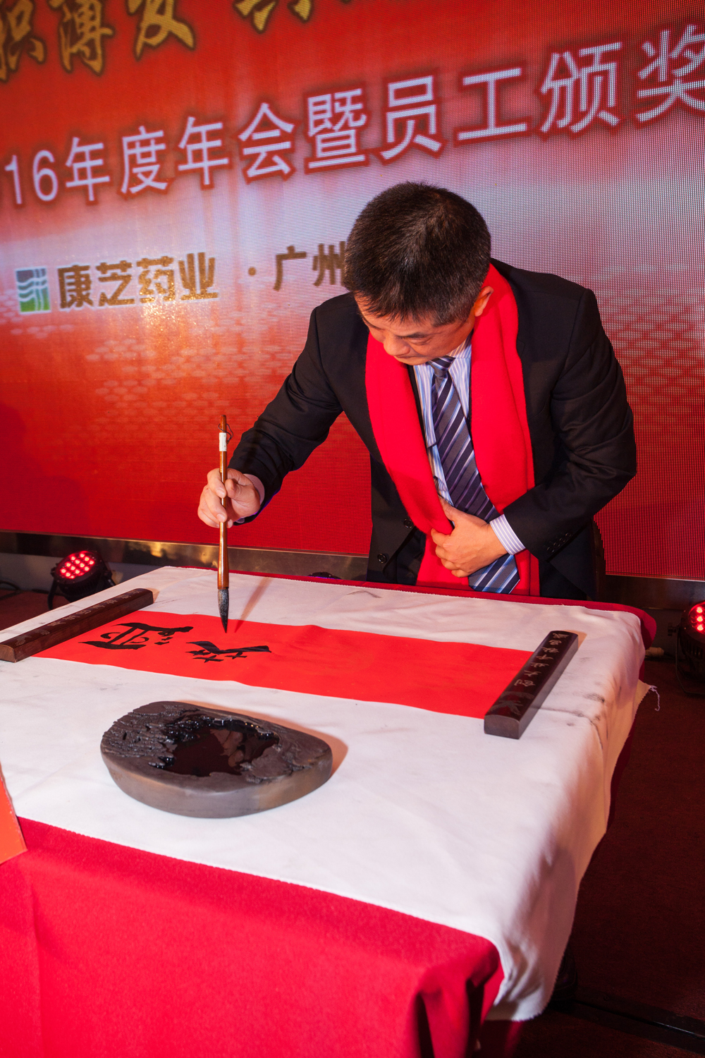 晚會上,除了精彩的水晶鼓和員工歌舞表演,董事長洪江游先生也大展歌喉,為大家獻唱一曲,將氣氛推向高潮。深情的演唱令員工們情緒高漲,接連上臺獻花。康芝藥業副總裁李幽泉先生也在悠揚的古箏伴奏中,登臺獻上墨寶,將“福”字送給大家。