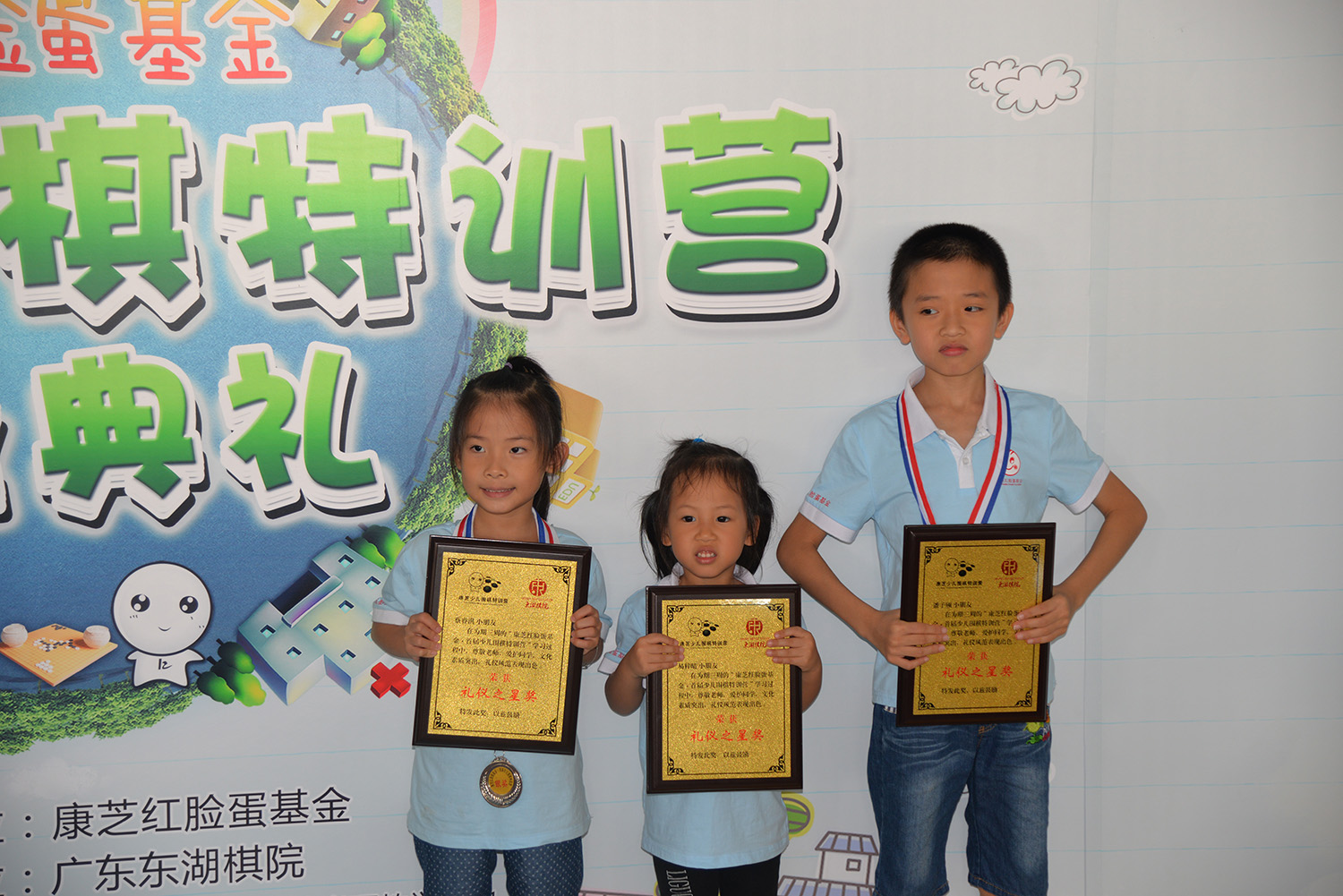 當(dāng)天的對(duì)弈積分賽中,小學(xué)員們初露頭角。對(duì)弈過(guò)程遵守圍棋禮儀,舉棋落子間運(yùn)籌帷幄,已頗有小棋手風(fēng)范。綜合兩輪對(duì)弈賽的積分,最終排名前十位的小學(xué)員分別獲得了金、銀、銅牌。根據(jù)孩子們?nèi)芤詠?lái)的表現(xiàn),特訓(xùn)營(yíng)還評(píng)選出了“禮儀之星”、“飛躍之星”和“明日之星”各四名,現(xiàn)場(chǎng)由嘉賓為獲獎(jiǎng)學(xué)員頒發(fā)榮譽(yù)獎(jiǎng)牌。
