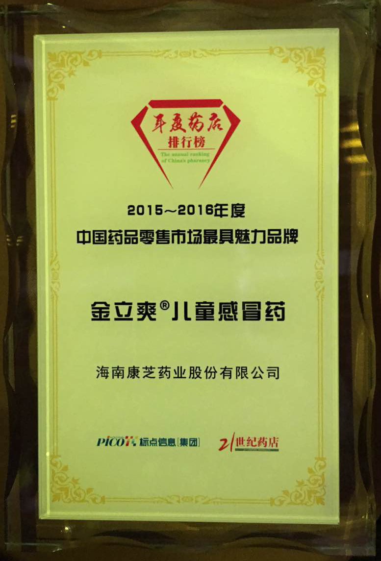 11月24日晚,由CFDA南方醫藥經濟研究所指導、《21世紀藥店》舉辦的2015-2016年度中國藥品零售市場品牌評選活動在廣州白云國際會議中心揭曉結果。康芝藥業旗下金立爽?兒童感冒藥在眾多品牌中脫穎而出,榮獲“2015-2016年度中國藥品零售市場最具魅力品牌”稱號。