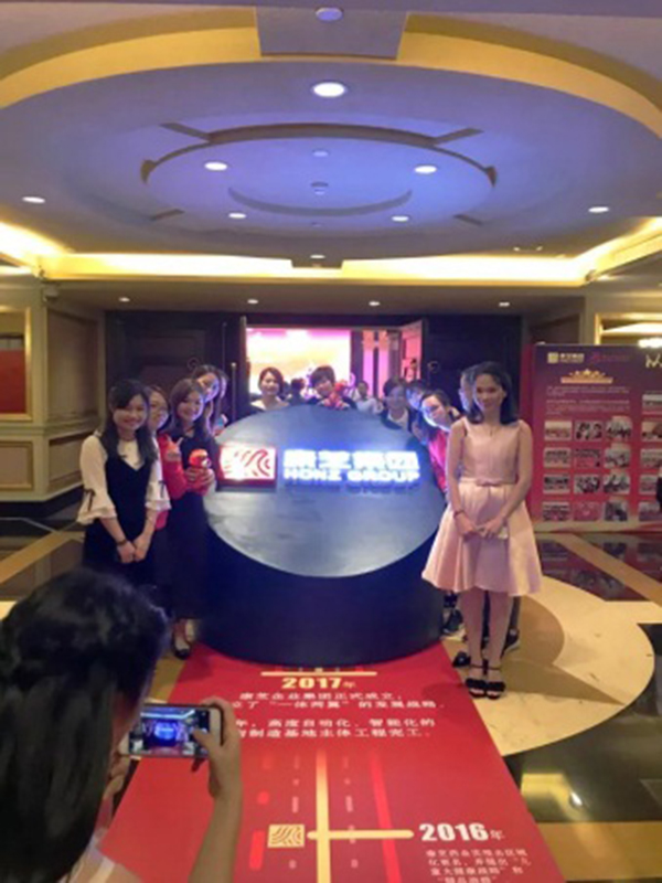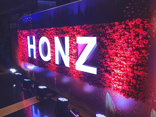 晚會景墻,鮮花群放,HONZ環(huán)繞其中,喜氣洋溢,歡迎八方來賓。