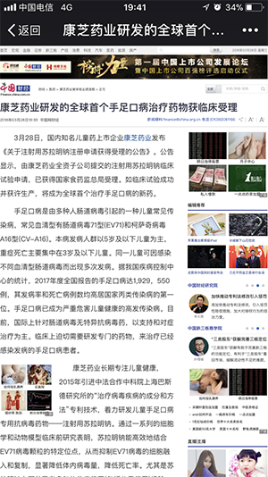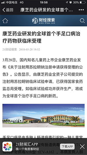 康芝藥業(yè)長(zhǎng)期專注兒童健康,2015年引進(jìn)中法合作中科院上海巴斯德研究所的“治療病毒疾病的成分和方法”專利技術(shù),著力研發(fā)兒童手足口病專用抗病毒藥物——注射用蘇拉明鈉。通過一系列的細(xì)胞學(xué)和動(dòng)物模型臨床前研究表明,蘇拉明鈉能高效地結(jié)合EV71病毒顆粒的特定位點(diǎn),從而抑制EV71病毒的細(xì)胞融入和復(fù)制,顯著降低體內(nèi)病毒量,降低死亡率。尤其是蘇拉明鈉在國外已有多年的臨床使用(包括兒童使用)經(jīng)驗(yàn),臨床療效明確,毒副作用已知和可控,并被世界衛(wèi)生組織分別收錄進(jìn)《基本藥物目錄》和《12歲以下兒童基本藥物目錄》。