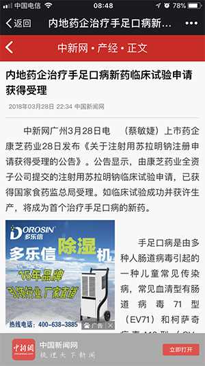 3月28日晚間,康芝藥業(yè)發(fā)布《關(guān)于注射用蘇拉明鈉注冊(cè)申請(qǐng)獲得受理的公告》。公告顯示,由康芝藥業(yè)全資子公司提交的注射用蘇拉明鈉臨床試驗(yàn)申請(qǐng),已獲得國家食藥監(jiān)總局受理。如臨床試驗(yàn)成功并獲許生產(chǎn),將成為全球首個(gè)治療手足口病的新藥。