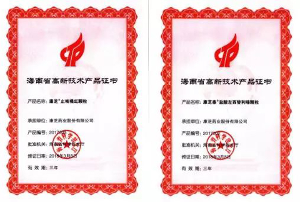 近日,康芝藥業(yè)研發(fā)生產(chǎn)的精品鹽酸左西替利嗪顆粒(康芝泰?)和止咳橘紅顆粒(康芝?),榮獲海南省高新技術(shù)產(chǎn)品榮譽(yù)證書,充分肯定了康芝藥業(yè)近年來在產(chǎn)品研發(fā)及技術(shù)創(chuàng)新領(lǐng)域的成績。
