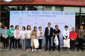 此次拔河比賽還穿插舉辦了康大工會羽毛球俱樂部成立儀式。儀式上,由海南康大投資有限公司副總經理、工會主席梁君先生為俱樂部第一屆會長林佳女士,第一屆副會長王春穎女士,女隊教練王虹蓉女士,男隊教練周義超先生頒發了聘任證書,并進行授旗。