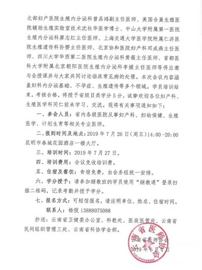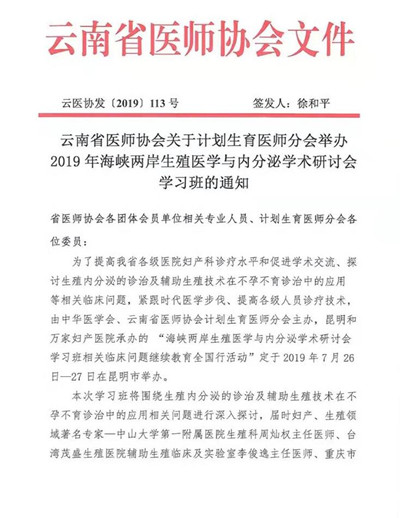 云南省醫(yī)師協(xié)會(huì)關(guān)于計(jì)劃生育醫(yī)師分會(huì)舉辦2019年海峽兩岸生殖醫(yī)學(xué)與內(nèi)分泌學(xué)術(shù)研討會(huì)學(xué)習(xí)班的通知
