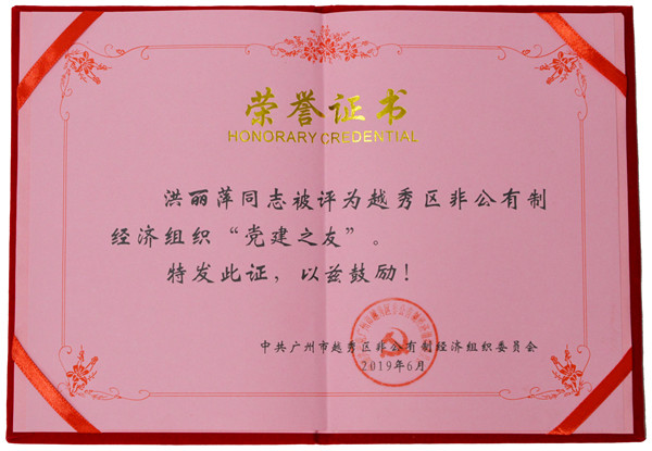 為樹立典型,弘揚先進,進一步推進非公有制經濟組織健康發展,推進非公有制經濟組織黨建工作,在紀念中國共產黨成立98周年之際,廣州市越秀區非公有制經濟組織黨委在非公有制經濟組織中開展“黨建之友”評選活動,康芝藥業副董事長兼副總裁洪麗萍同志榮獲越秀區非公有制經濟組織“黨建之友”榮譽稱號。
