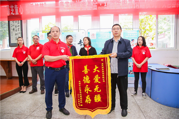 為鼓勵孩子們多讀書、讀好書,龍殿康先生向花水灣小學校長何平贈送了“愛心共建學校”牌匾。接著,花水灣鎮學校校長幸貴明代表學校給康芝藥業贈送了“大愛無疆 善德永存”的錦旗。