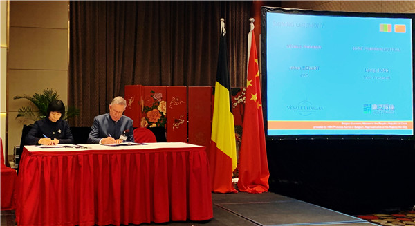 △康芝藥業(yè)副董事長(zhǎng)兼副總裁洪麗萍(左)與Vésale Pharma公司董事長(zhǎng)Jehan Lienart(右)簽署協(xié)議