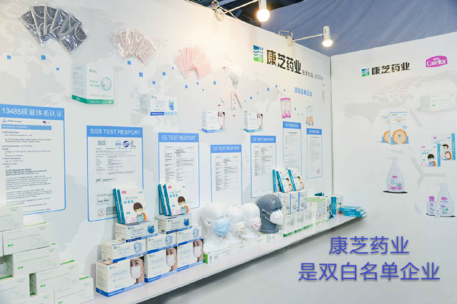 康芝藥業在此次展會上全方位展示了防疫產品,包括醫用口罩、兒童口罩、防護口罩以及消毒產品。