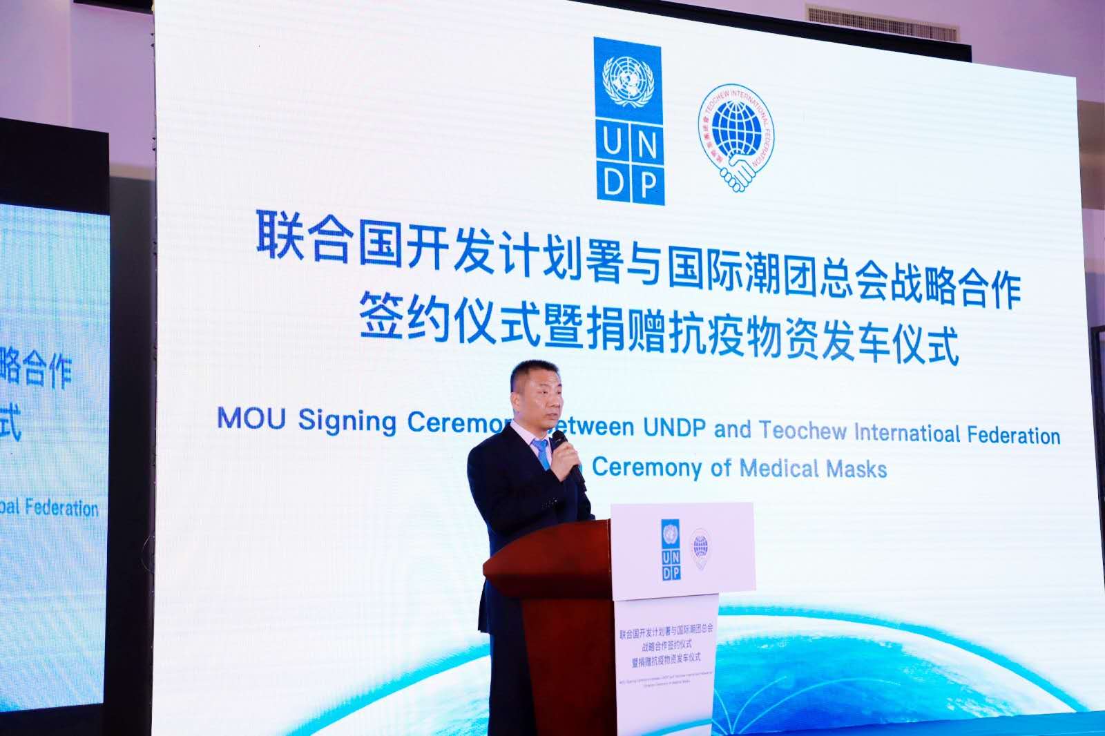 除捐贈抗疫物資發車儀式外,活動中,國際潮團總會主席洪江游、執行主席陳幼南博士代表國際潮團總會簽署了與聯合國開發計劃署的合作備忘錄,雙方正式建立戰略合作伙伴關系。