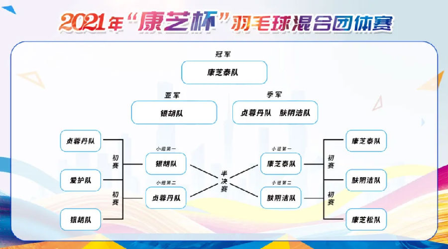 本次比賽共設混雙1、男雙、混雙2三項比賽,均由小組賽及決賽兩部分組成。每項比賽小組賽均采取隨機抽簽分組的形式兩兩對決,按三局兩勝制逐輪晉級進入決賽;兩個小組的第一和第二交叉淘汰賽,兩支勝隊進入總決賽。經過激烈的角逐,比賽圓滿落下帷幕。最終,康芝泰隊奪得冠軍,銀胡隊獲得亞軍,膚陰潔隊、貞蓉丹隊并列獲得第三。