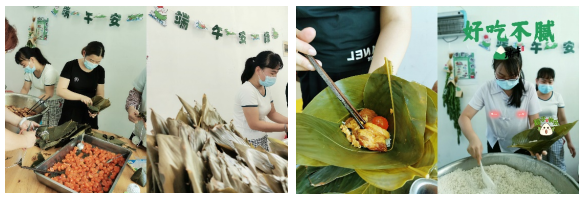 在這生產(chǎn)繁忙之際,生產(chǎn)技術(shù)部仍借調(diào)3名員工到后廚幫忙包粽子,只為保證員工們能吃上新鮮可口的粽子。雪白的糯米、青翠的粽葉,在一陣眼花繚亂的包、裹、纏、繞后,變成了有棱有角的粽子。大家你一個(gè)、我一個(gè),將粽子全部包好,供員工們午餐享用。