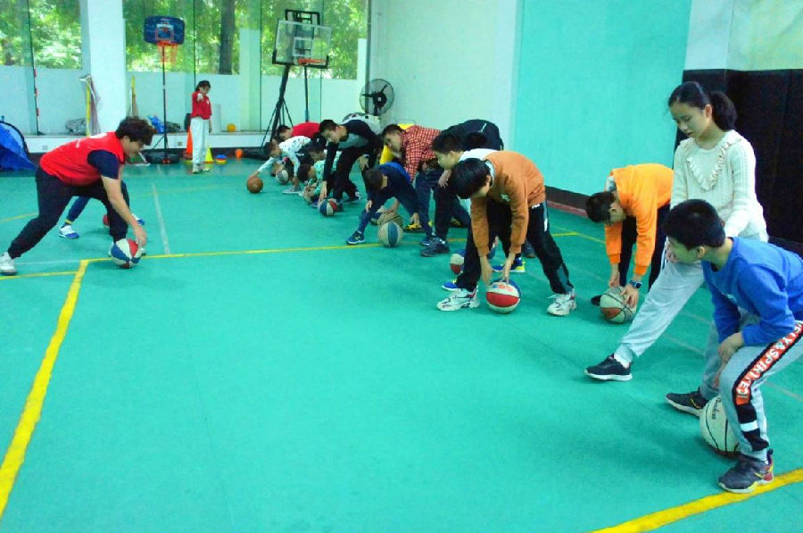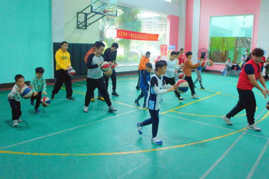 講解完畢,孩子們就已經(jīng)開始躍躍欲試。活動(dòng)伊始,孩子們嘗試著于他們而言新穎的籃球游戲。因?yàn)閺奈唇佑|過籃球,他們尚未完全掌握游戲的要領(lǐng),動(dòng)作也比較生疏,但是在一眾家長(zhǎng)和志愿者的鼓勵(lì)與幫助下,孩子們大汗淋漓地游玩著,用心地對(duì)待每一個(gè)游戲環(huán)節(jié),歡笑不斷,嬉笑玩鬧著,現(xiàn)場(chǎng)洋溢著幸福滿足的氣息。球場(chǎng)上孩子們跑動(dòng)的身影、童真的笑容,仿佛黑夜中星星般的光芒,讓我們?nèi)滩蛔∨南抡掌糇∵@一刻難得的美好。