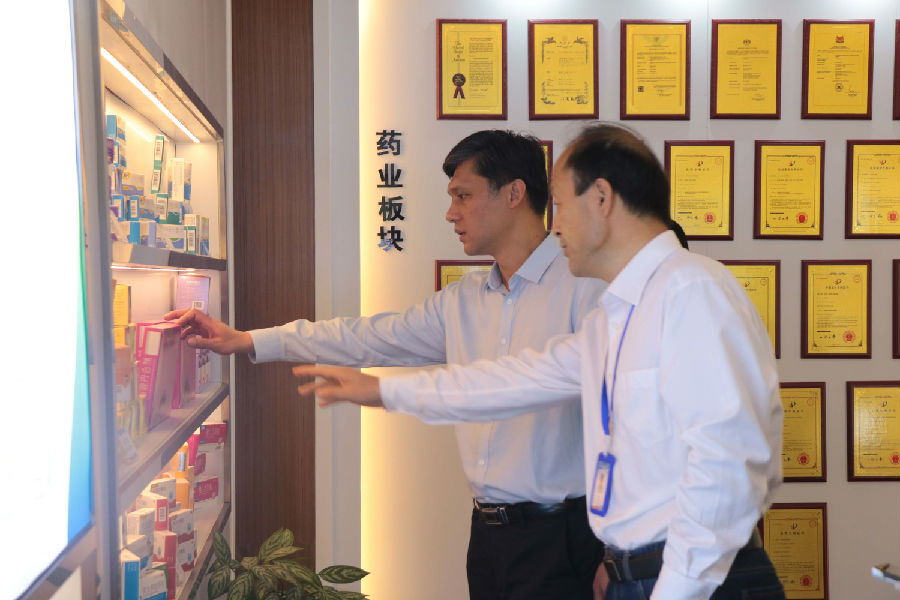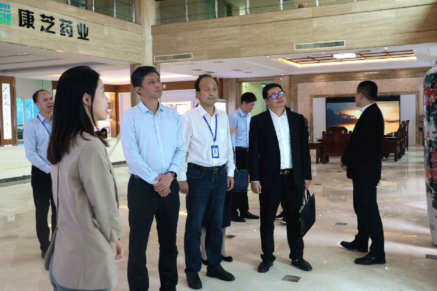 在高洪??偨浝淼膸ьI下,江西省贛州市副市長鄒治宇參觀了康芝藥業展廳,深入了解康芝藥業的發展歷程、明星產品以及研發實力等。
