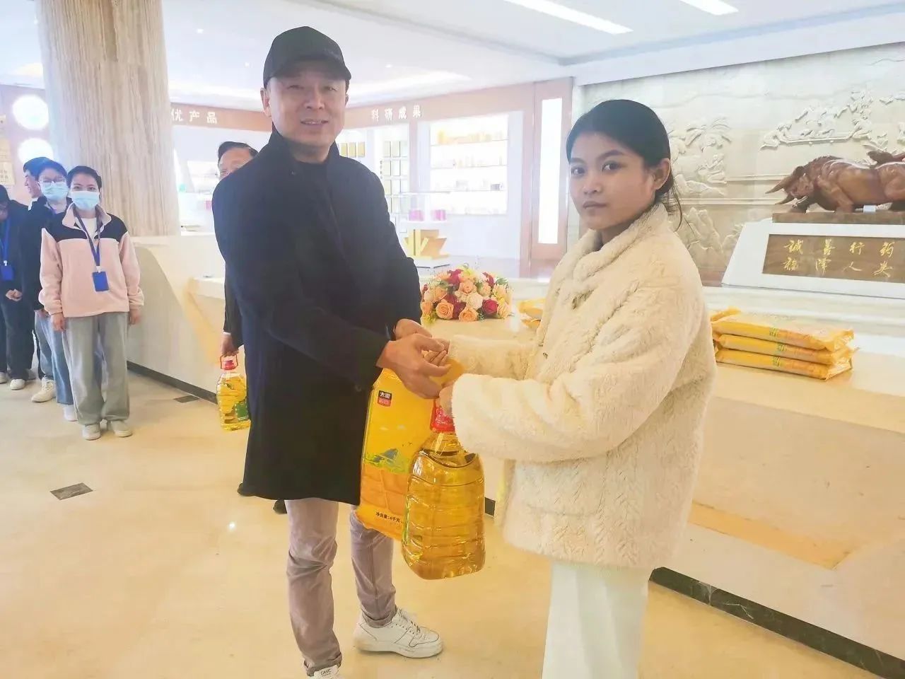 福利發(fā)放現(xiàn)場秩序井然,董事長辦公室何子群總也代表公司將滿載祝福的春節(jié)福利送到員工手中,拿到福利的每一位員工都洋溢著幸福的微笑。