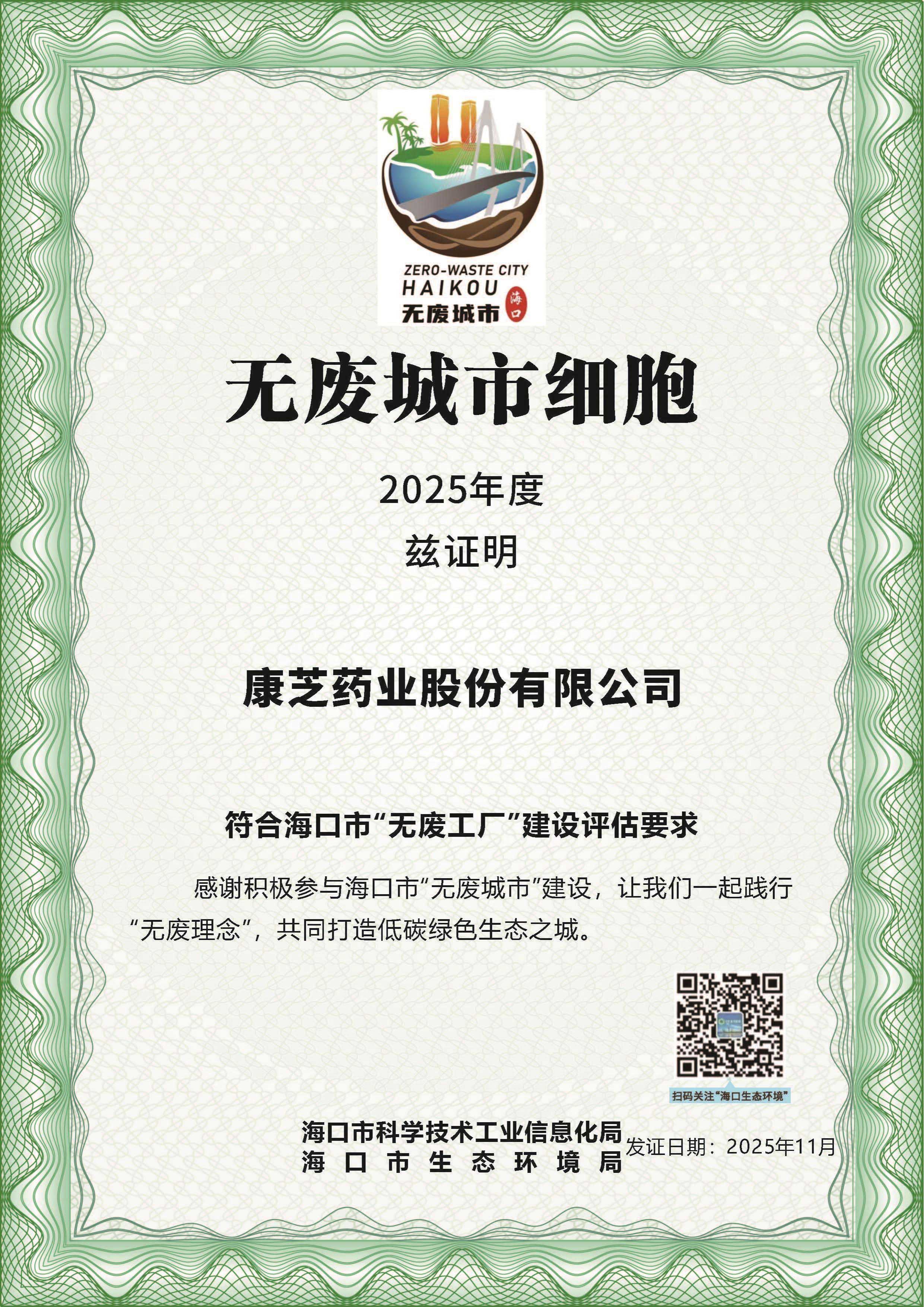 2025年11月10日,康芝藥業(yè)收到海口市科學(xué)技術(shù)和工業(yè)信息化局、海口市生態(tài)環(huán)境局聯(lián)合頒發(fā)的海口市“無廢工廠”證書。這是繼今年9月被海南省工業(yè)和信息化廳認(rèn)定為“海南省綠色工廠”后,公司在綠色生產(chǎn)和可持續(xù)發(fā)展領(lǐng)域的成果再度獲得權(quán)威認(rèn)可。