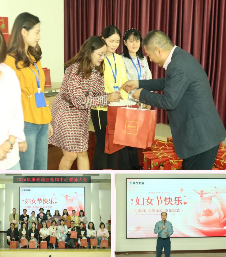 鐵軍再出征,巾幗勇擔當。廣大女職工或奮戰在市場前沿,或深耕在后勤保障,用專業與熱忱扛起營銷工作的“半邊天”。3月7日,康芝藥業2026年營銷中心誓師大會召開期間,工會特別舉辦了婦女節關懷活動,董事長洪江游親臨現場為女職工派發節日禮品,工會主席龍殿康主持活動儀式。一份份精致禮品,傳遞了康芝對“她力量”的崇高敬意,進一步凝聚起奮進新征程的強大力量。