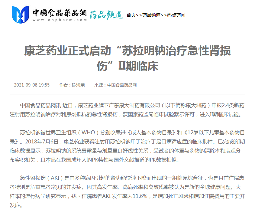 康芝藥業旗下廣東康大制藥有限公司(以下簡稱康大制藥)申報2.4類新藥注射用蘇拉明鈉治療對利尿劑抵抗的急性腎損傷,獲國家藥監局臨床試驗默示許可,進入II期臨床試驗。