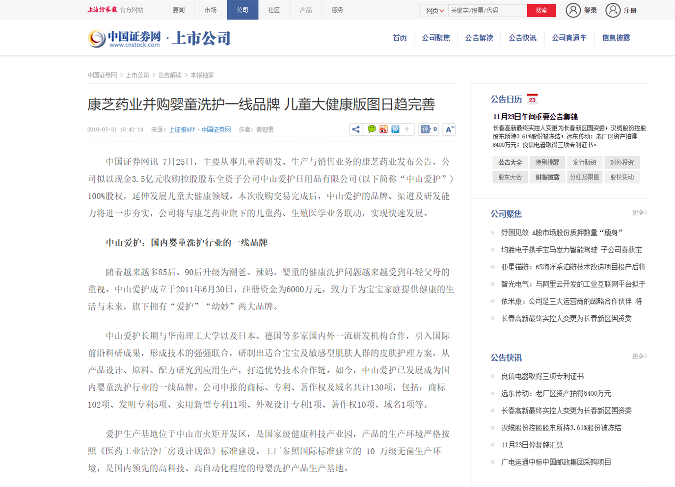 查看詳情7月25日,康芝藥業發布公告,公司擬以現金3.5億元收購控股股東全資子公司中山愛護日用品有限公司100%股權,延伸發展兒童大健康領域。